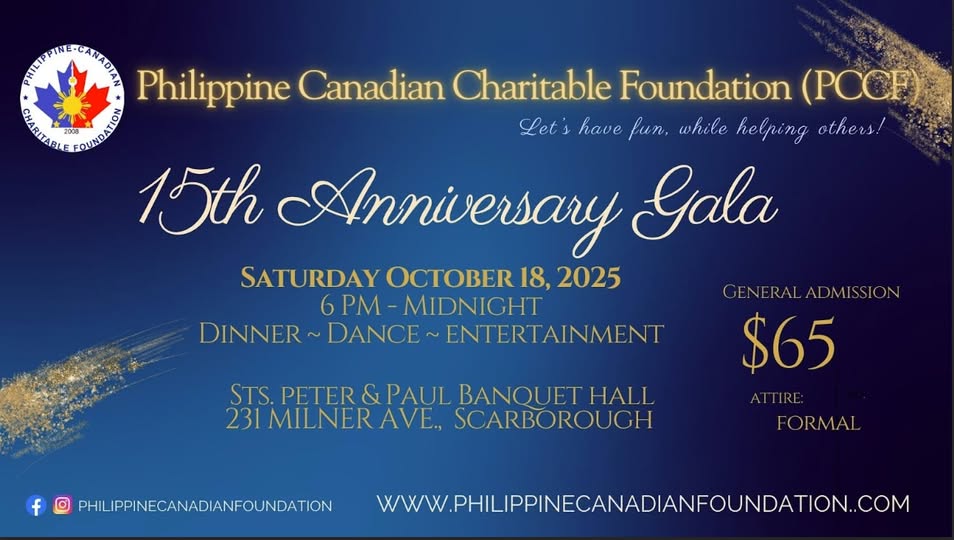 The Philippine Canadian Charitable Foundation is hosting their annual gala on Sat. Oct. 18, 6pm, at St. Peter & Paul Banquet Hall. Tickets are $65 each.