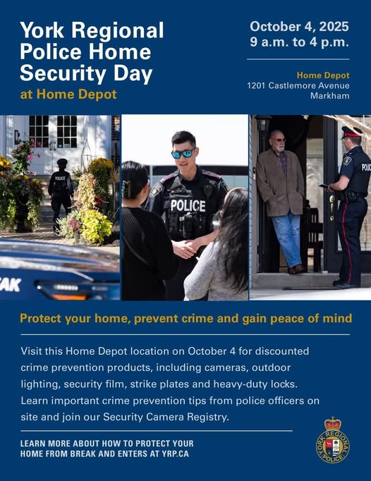 Come learn about home security from the York Reginal Police, Oct. 4, 9am to 4pm.