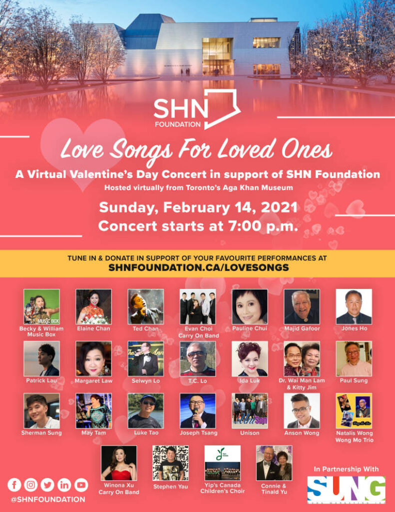 The Scarborough Hospital Network Foundation invites you to join them virtually on February 14 at 7 pm for the Love Songs for Loved Ones concert! Tune in to www.shnfoundation.ca/lovesongs and watch professional and amateur performers singing in support of SHN Foundation.