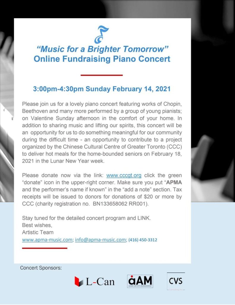 Join us for a virtual live Piano Concert “Music for a Brighter Tomorrow” – a fundraising event, please refer to details in flyer! Sunday, Feb. 14, 3:00pm to 4:30pm.