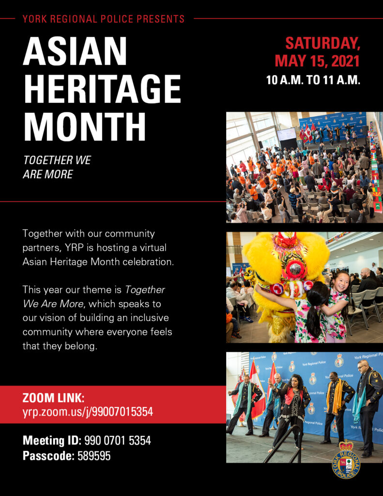 York Regional Police in partnership with the Canadian Multicultural Council – Asians in Ontario are pleased to host Asian Heritage Month – this event celebrates the rich diversity of our Asian community.