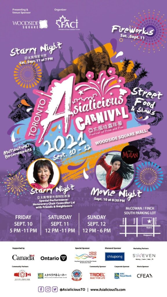 The 2021 Asialicious Carnival is on this weekend, Sept. 10, 11 & 12 at Woodside Square, Scarborough. Please refer to details & times on flyer.
