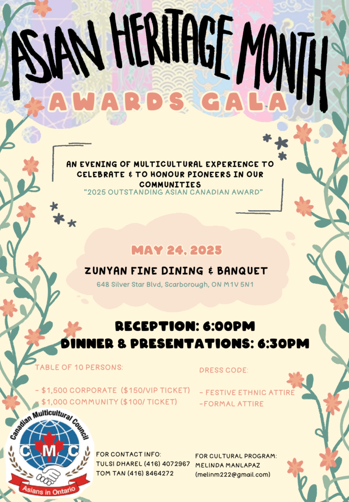 The Canadian Multicultural Council – Asians in Ontario (CMC) is a Toronto based non-profit, non-political umbrella organization of more than twenty Asian Canadian associations representing various Asian countries and cultures.
